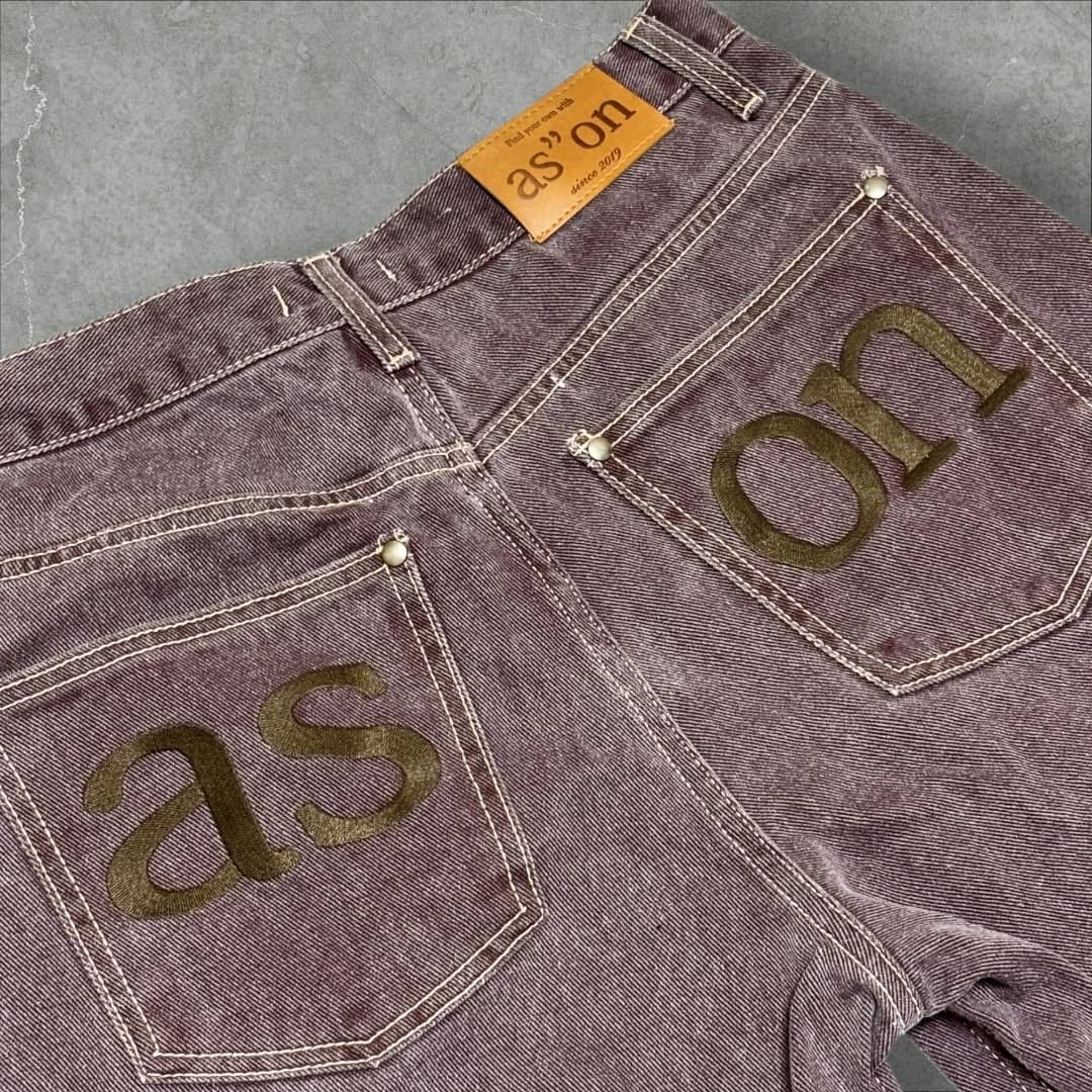 가장 눈길을 끌었던 건 바로 이 'ASON SMOG WIDE PANTS / PURPLE' 팬츠였어요. 넉넉한 와이드 핏에 오묘한 퍼플 스모그 워싱이 정말 매력적이었는데요, 뒷주머니에 빅 로고 포인트까지 더해져서 시선을 사로잡기에 충분했답니다. 🤩 예전에 단종된 레어템이라고 해서 더 탐났어요! (아쉽게도 제가 방문했을 땐 이미 품절이었다는... 😭)