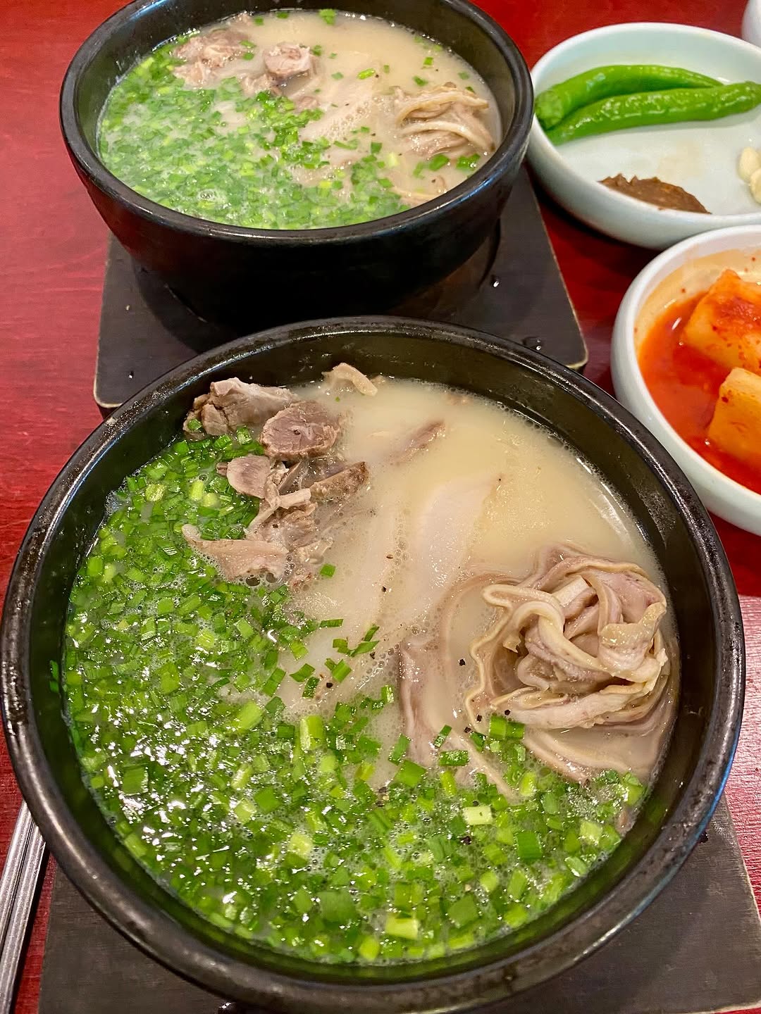 ✨ 진한 엄용백 돼지국밥: 사골뼈, 목뼈, 등뼈, 돈족을 오랜 시간 푹 우려낸 뽀얀 육수는 마치 진한 보양식 삼계탕이나 묵직한 돈코츠 라멘 육수를 연상시킬 정도로 깊고 구수했어요. 생강, 마늘, 당귀를 넣어 풍미를 더했다는데, 이 한방 향이 은은하게 퍼지면서 속을 든든하게 채워주는 느낌! 💪 뽈항정살, 토시살, 오소리감투가 푸짐하게 들어있어서 건져 먹는 재미도 쏠쏠했답니다.