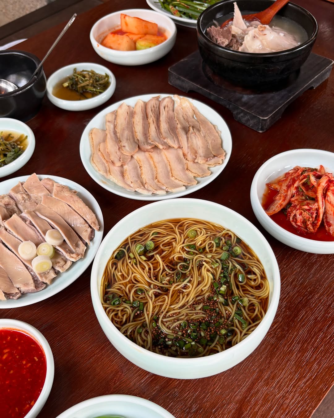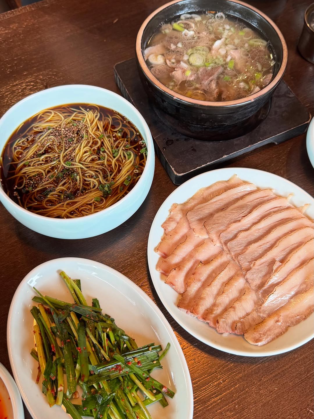 그리고 이 집의 또 다른 별미는 바로 항정수육과 간장국수 세트! 👍 항정살 특유의 야들야들함과 기름진 맛을 토치로 살짝 그을려 불향을 입혀서 느끼함을 잡아줬는데, 이게 또 별미더라고요. 🤩 짭짤하면서도 고소한 간장 양념에 쫄깃한 면발, 거기에 톡톡 씹히는 통깨까지! 이건 진짜 국수 전문점이라고 해도 믿을 정도로 완성도 높은 맛이었어요. 💖