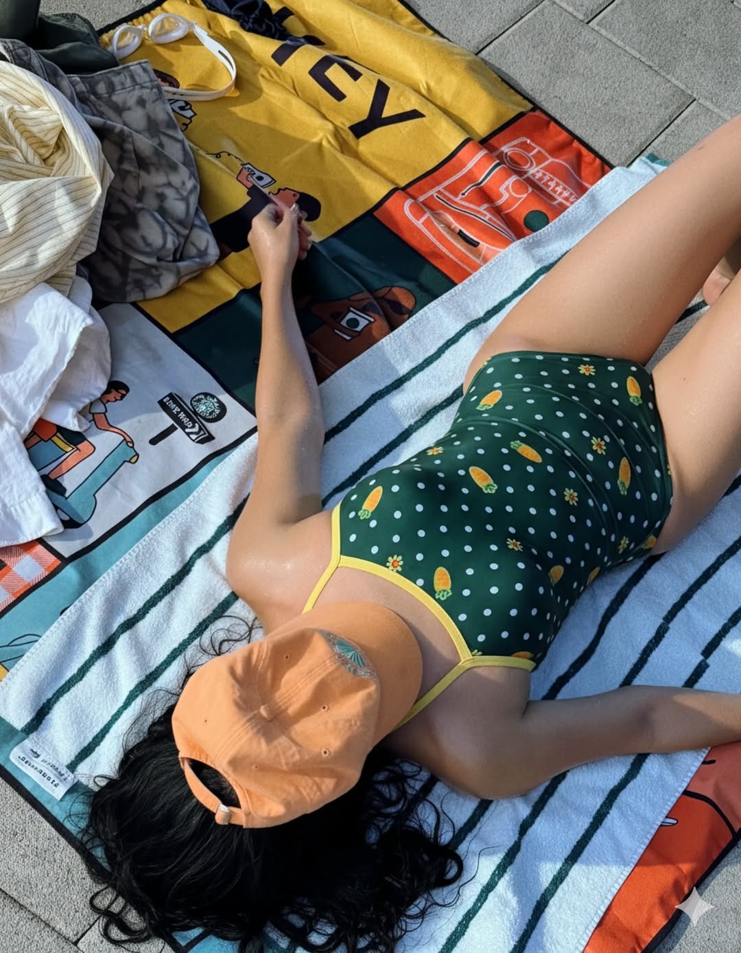 화려한 패턴의 수영복에는 심플한 디자인의 수모나 단색 가방을 매치해서 전체적인 밸런스를 맞춰주는 것이 좋아요.